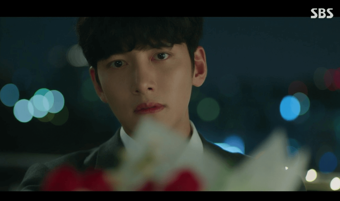 加盟店代表として本社の諮問委員会に参加した後コンビニへ戻ってきたデヒョンは、赤いチューリップの花束をセッピョルに渡した。