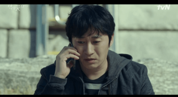 そして「知りたくない。」とブルブル震えるムジン( ソ・ヒョヌ )の口にガムテープを貼ると、18年前血まみれの顔で里長の死体を見下ろした時の光景を回想しながら「そうだ。 僕が殺した。 」と邪悪な微笑みを浮かべてささやいた。