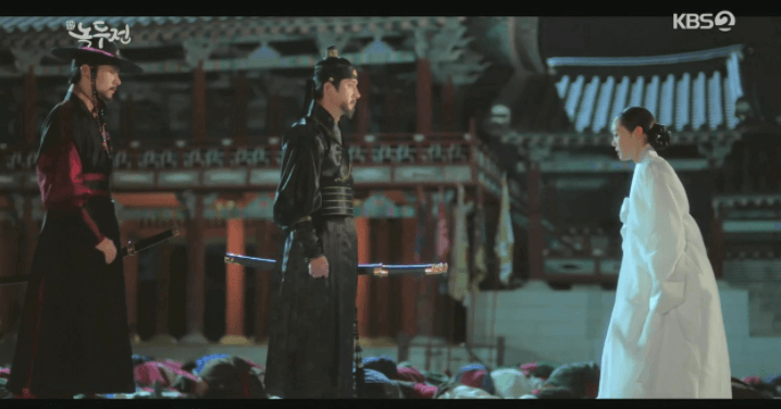 これに王が倒れそうになりながらも「罪人が自白した。 すぐに捕らえよ ! 」と命じたため、ムウォル団はノクドゥを守るために刀を構え、ファンテはノクドゥを支えて守った。