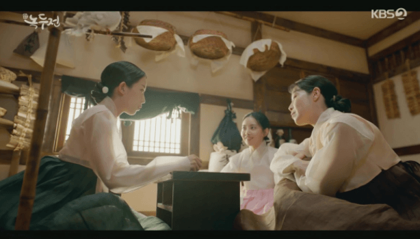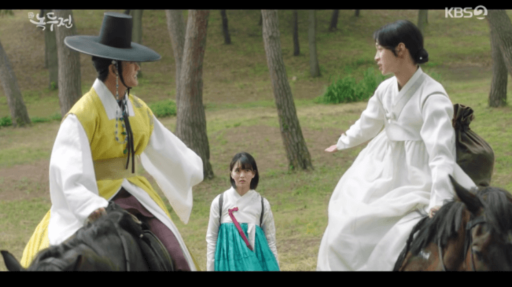 その後、ドンジュは「妓楼に行くついでだ。 遠慮するな ! 」というユルムと「年頃の娘を同乗させるおつもりか?娘よ。 乗りなさい ! 」というノクドゥの間で悩んだ末に、ユルムを選んだ。