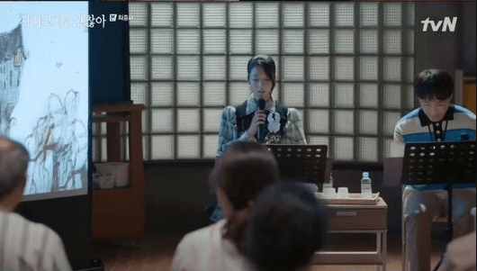 イ・サンインの挨拶のあとライトが落とされ出版記念朗読会が始まると、舞台に上がったガンテ・サンテ・ムニョン(ソ・イエジ)の3人は、仲良く本の朗読を初めた。