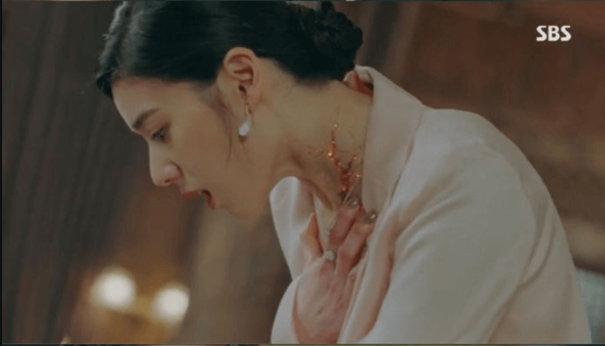 そして、イ・リムからゴンの毒殺を指示されたことを涙を流しながら告白したあと「 陛下に毒を盛る代わりに自分で飲みました。 死んで罪の代価を払おうと思い...。 もし生き延びれば、陛下にお目とおりするつもりでした。 あの子に罪はありません。 」とひざまづいて懇願するスクチンに深い溜め息をついた。